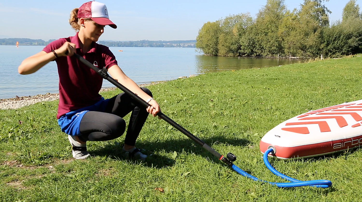 Die Paddle-Innovation vom Schweizer SUP-Pionier. Äusserlich unterscheidet sich das patentierte Paddle-System kaum von einem normalen SUP-Paddle. Die entscheidenden Änderungen wurden im Inneren des 3-teiligen Paddels vorgenommen. Die Luft wird durch einfache Pump-Bewegungen über den ausziehbaren Teil des Paddels erzeugt. Das Dichtungssystem erlaubt dabei einen ausreichend grossen Druck für aufblasbare Stand Up Paddleboards. Durch das geringere Volumen des Schaftes lässt sich der Druck mit massiv weniger Kraftaufwand erzeugen.